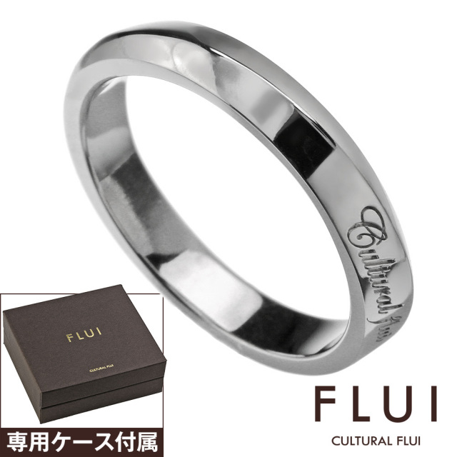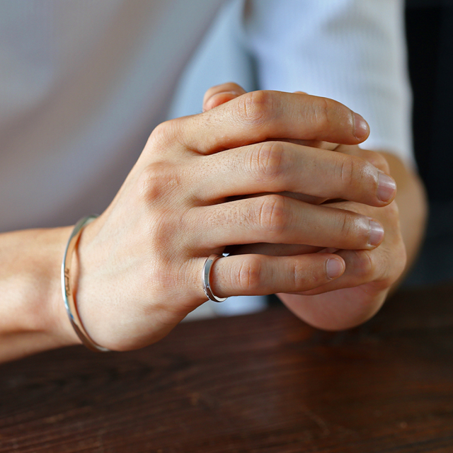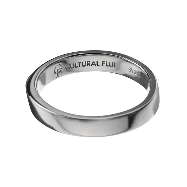 リングのなめらかさとエッジのコントラストが海の水面を思わせる美しいデザイン。プラチナ等によく用いられる仕法・ロジウムコーティングにより、高級感のある美しい輝きが楽しめます。FLUIが提案する、躍動感と静けさを、さりげなく上品に着けられるリングです。
