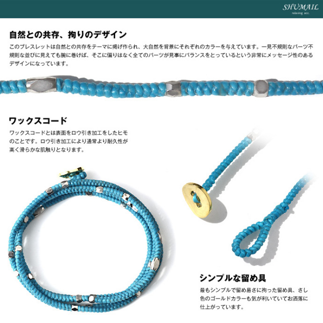 キメすぎず気軽に着けれるデザインがこのブランドの魅力。シルバーやレザーブレスとの重ねづけにも相性が良く、気分によってカラーを変えてみたりと幅の広い使い方が出来るブレスレットです。3重巻きでアンクレットとして使用してもお洒落です。このブレスレットは自然との共存をテーマに掲げ作られ、大自然を背景にそれぞれのカラーを与えています。